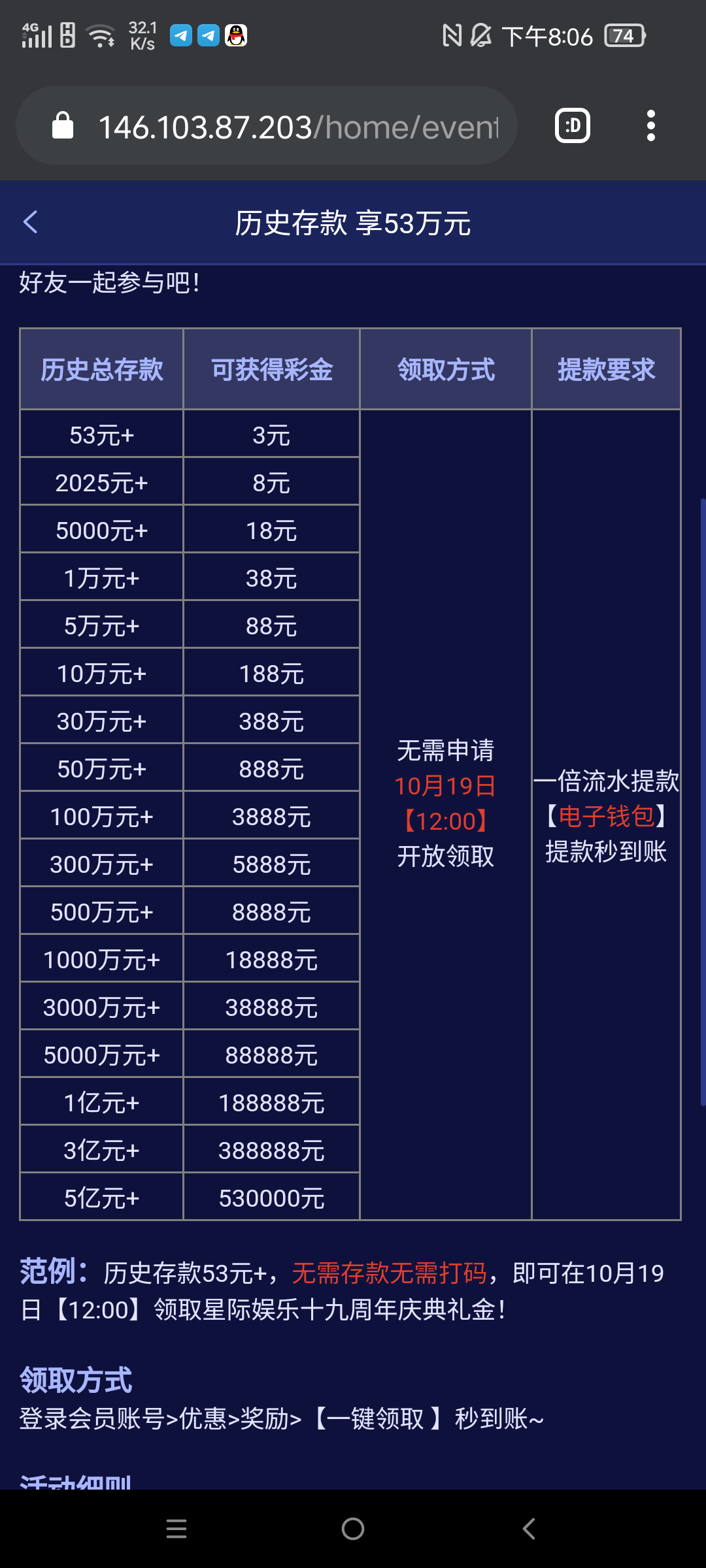 星际娱乐有周年历史存款彩金,中午12点后去领,有等级的去看看,每两小时还能抢一次红包