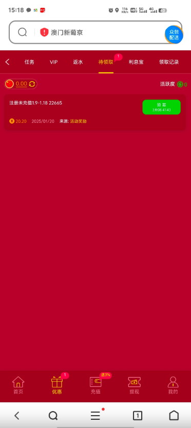 之前注册202,没有充值过的有回馈彩金20块,1.9号到1.18注册未充值的,这段注册过的老哥可以上号看看,我刚领到20,我是客服打电话来,直接到福利中心的,新玩家可以看看短信特邀看能不能领到