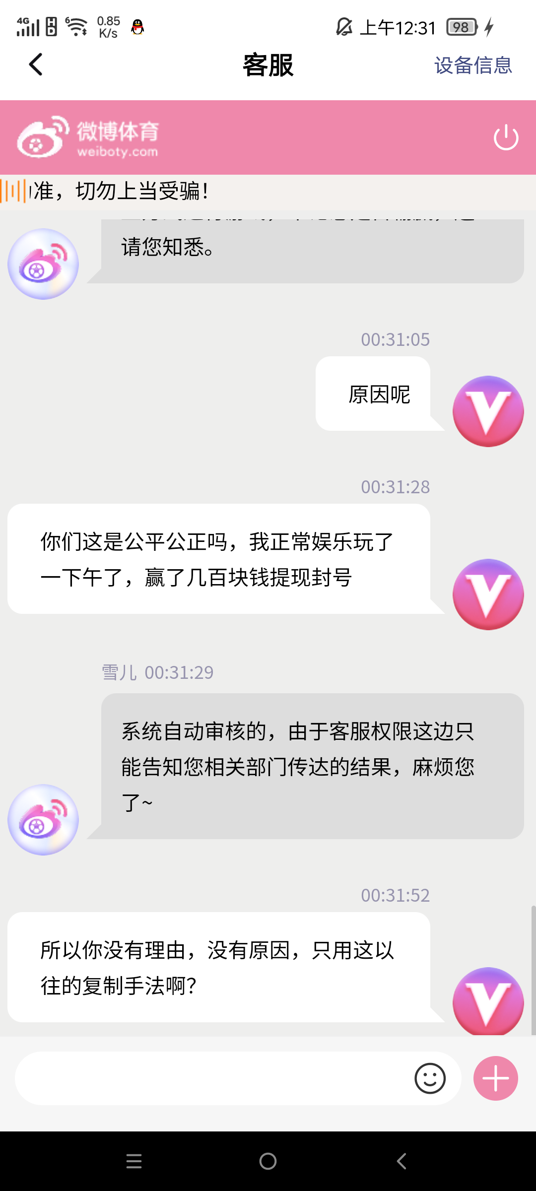 昨天充值450元,玩了几场电竞,还中了一个六合彩提现,800块,平台禁止提现,直接毫无理由的封号,客服装死一直复制粘贴消息,无任何违规操作投注,紧急避坑!