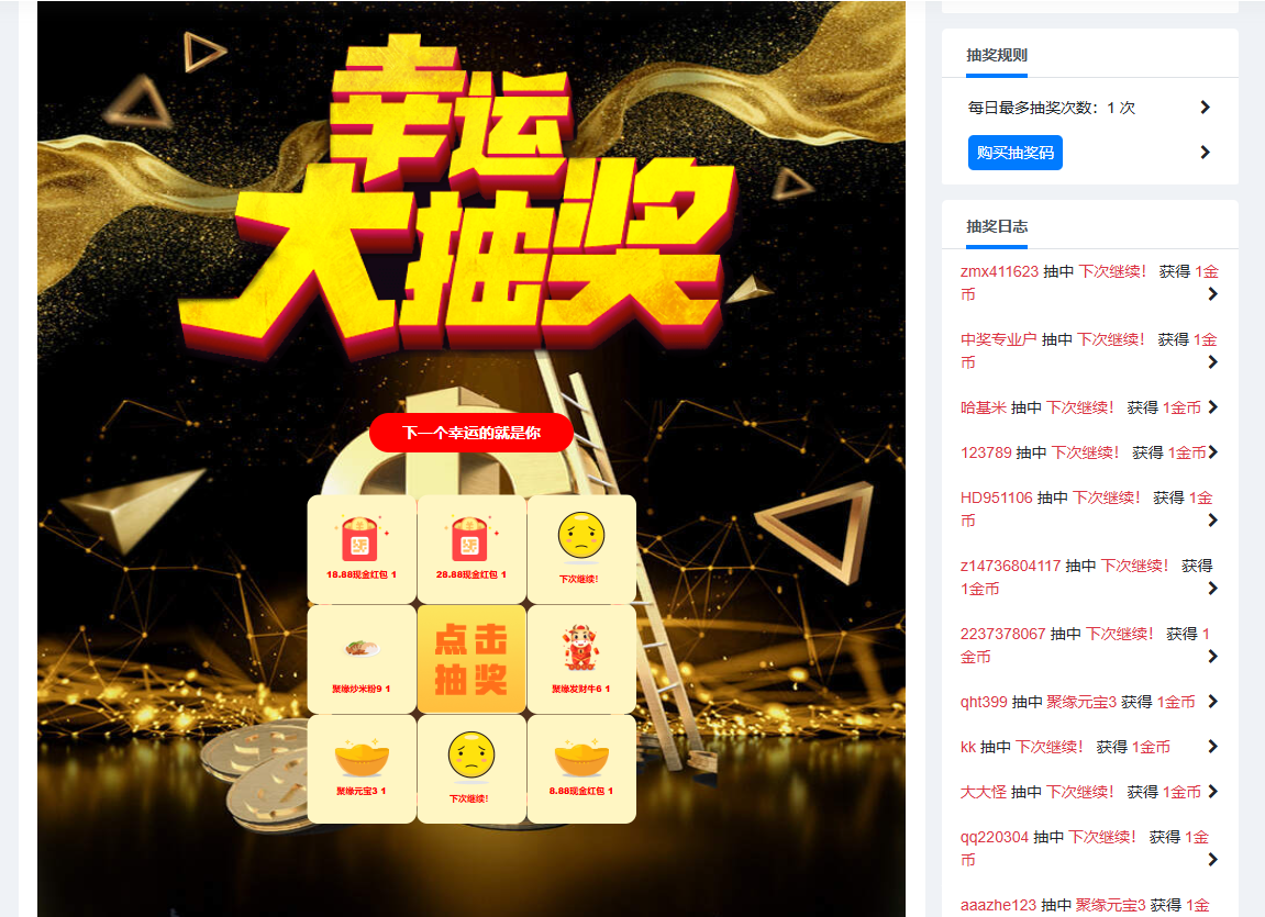 参与本站抽奖需要10金币兑换一次参与机会!点击购买抽奖码,每天能参与1次论坛抽奖